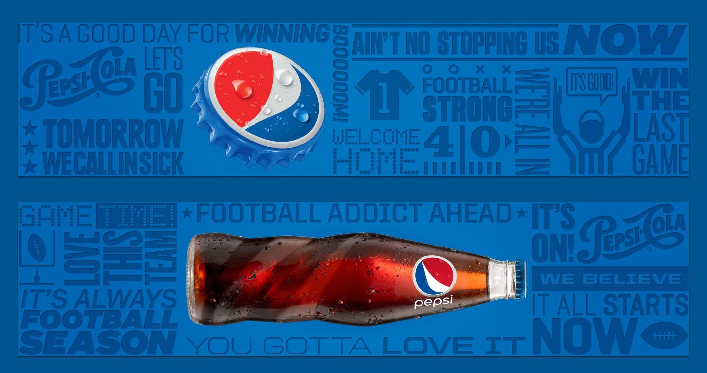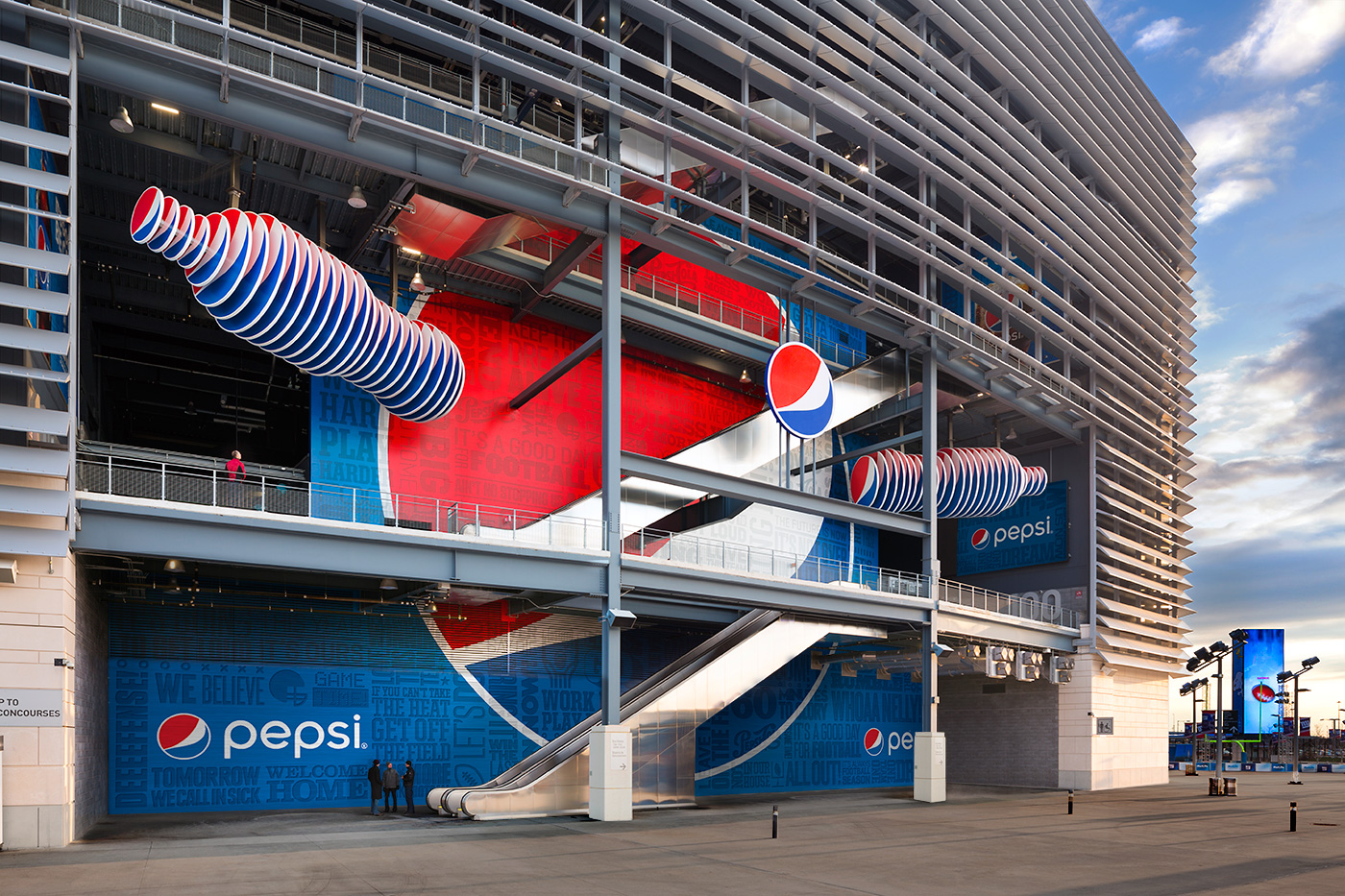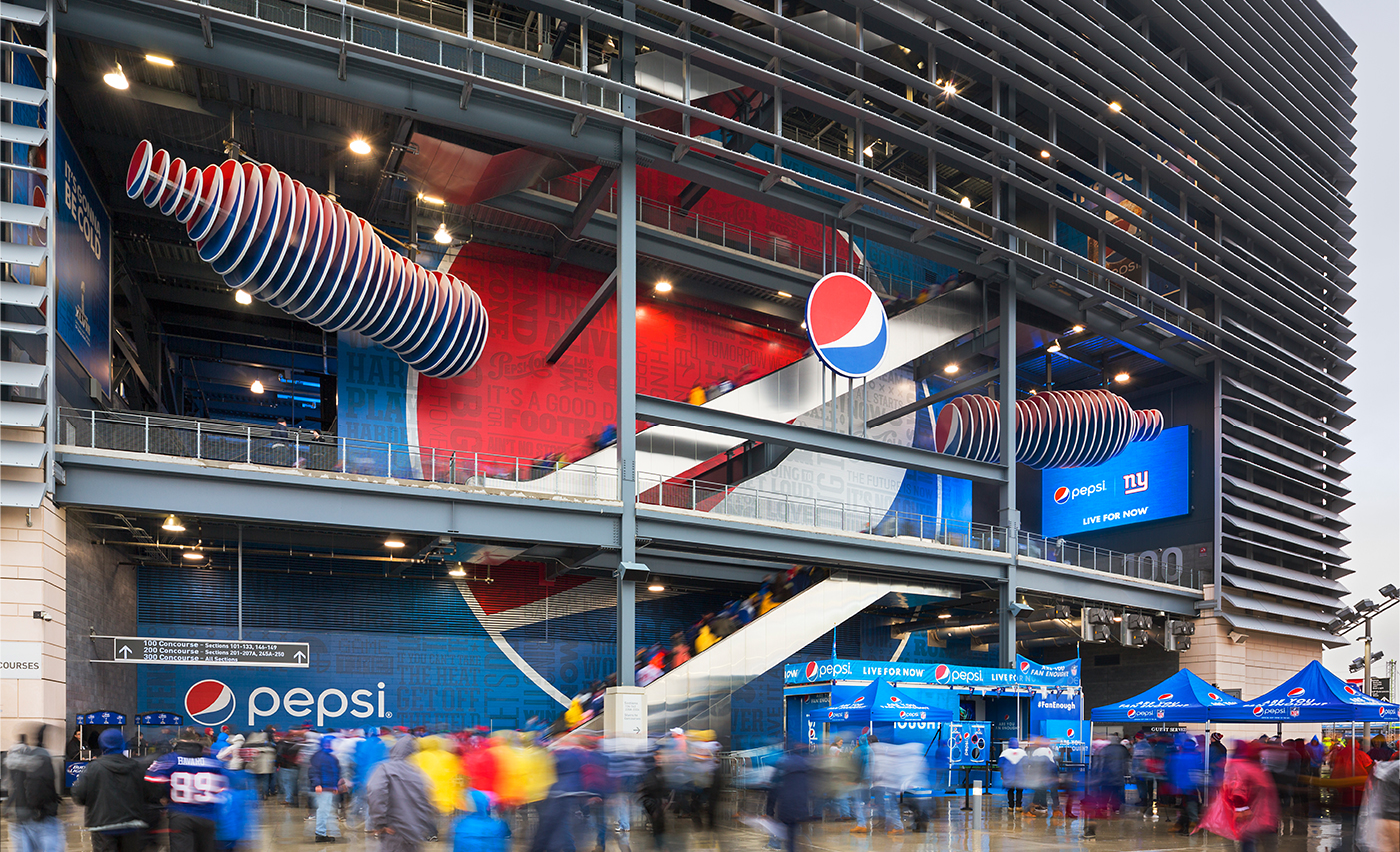 For Super Bowl XLVIII, we've created a dynamic welcoming experience for fans and friends at Metife Stadium - four floors tall supergraphics (approximately 140 feet wide) featuring Pepsi logo, banners, posters and two large scale installations mimic the shape of the new Pepsi bottle (approximately 40 feet wide and 8000lb each). The super graphic is a melting pot of typographic phrases and football icons. It represents the “Voice of fans.”