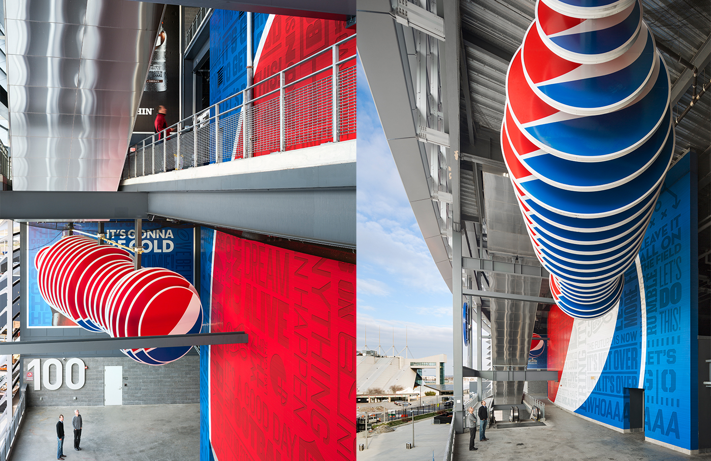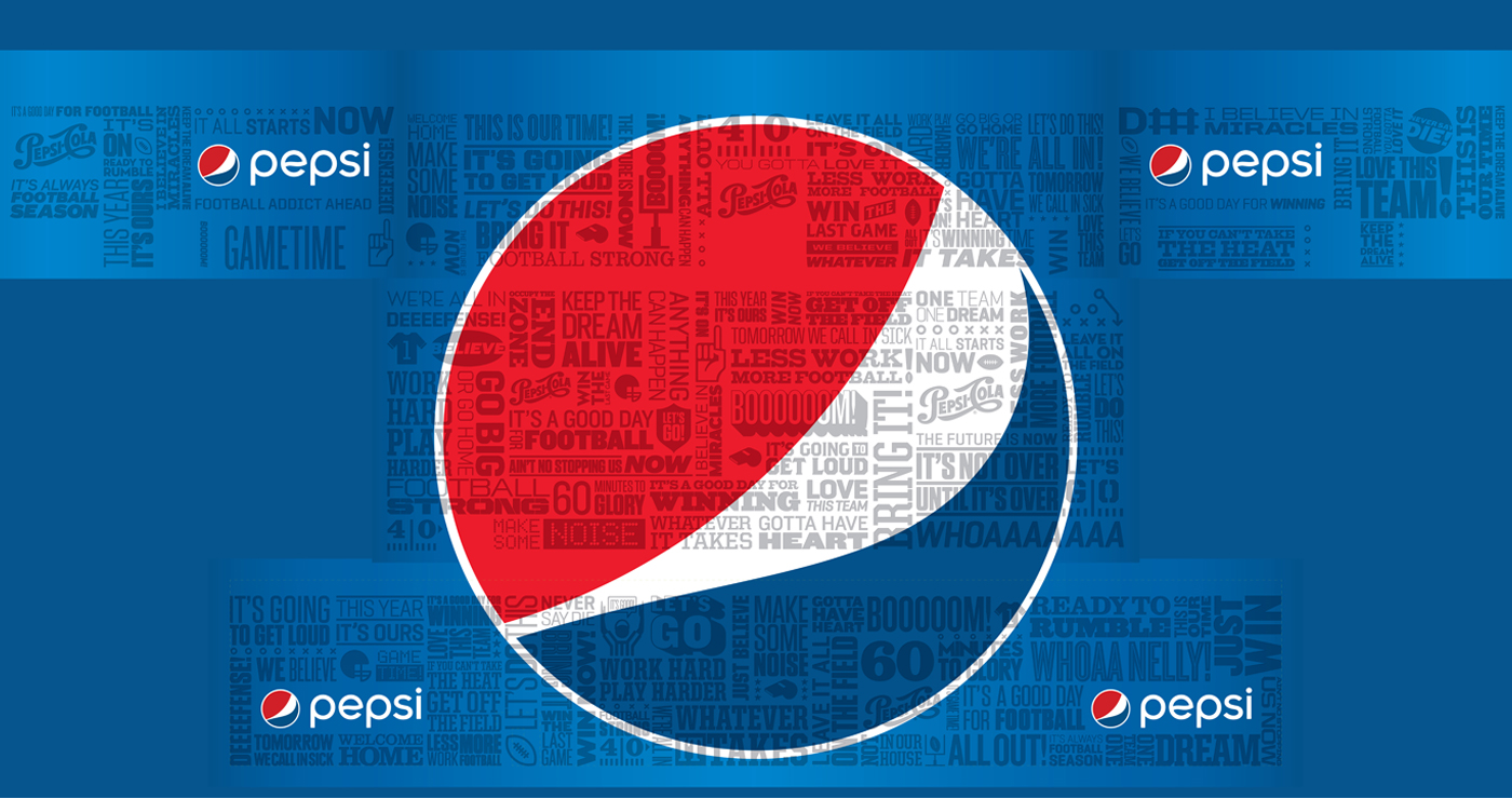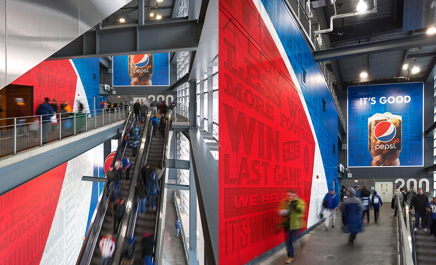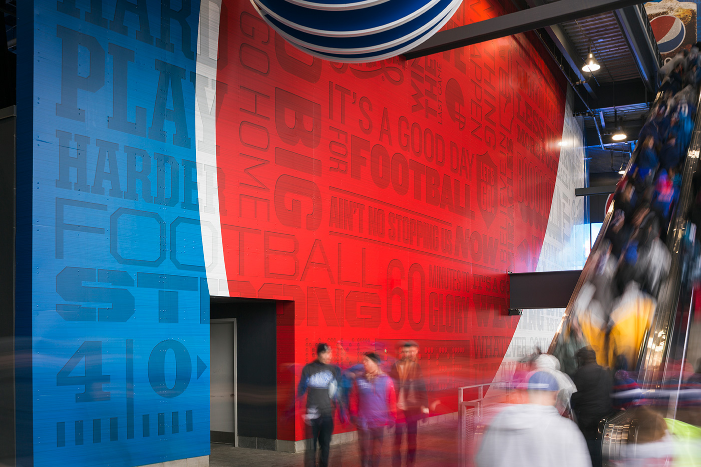 For Super Bowl XLVIII, we've created a dynamic welcoming experience for fans and friends at Metife Stadium - four floors tall supergraphics (approximately 140 feet wide) featuring Pepsi logo, banners, posters and two large scale installations mimic the shape of the new Pepsi bottle (approximately 40 feet wide and 8000lb each). The super graphic is a melting pot of typographic phrases and football icons. It represents the “Voice of fans.”