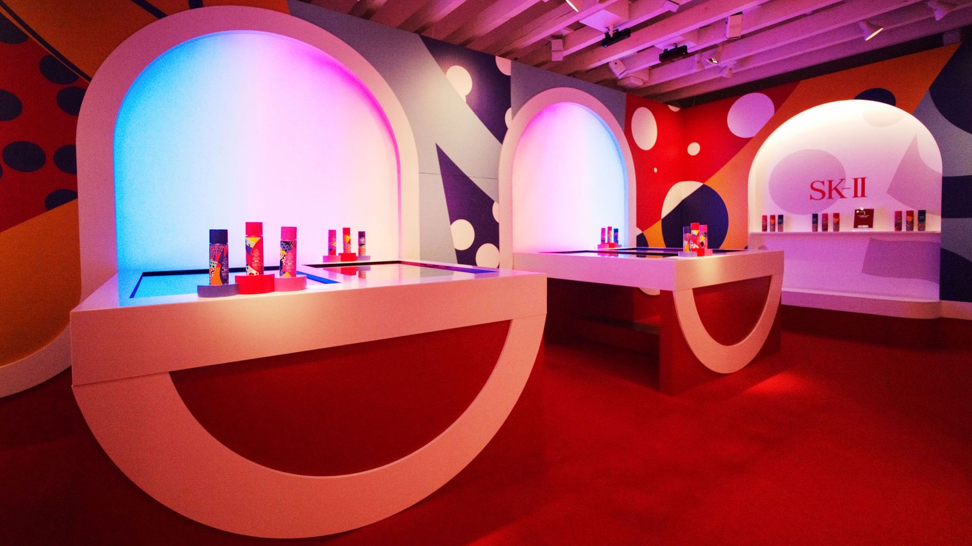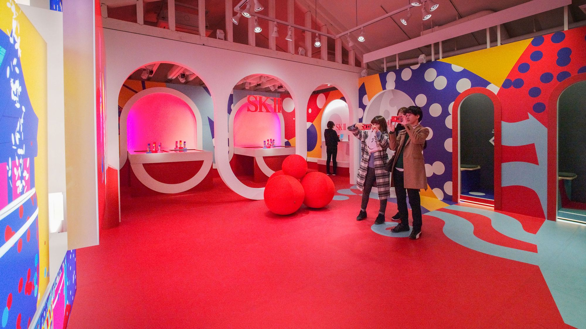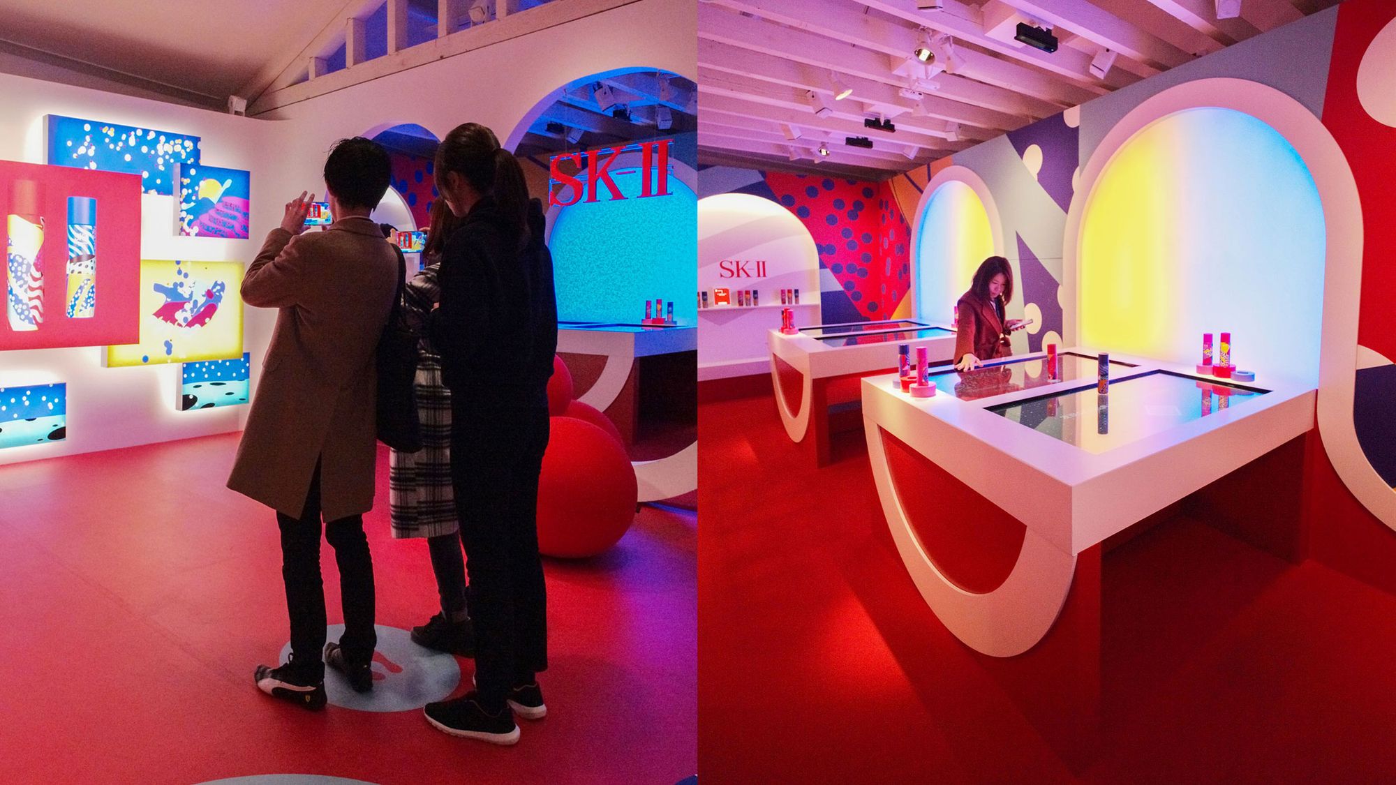 The first floor of the show has three rooms with each different designs inspired by the limited edition bottles. Visitors use the SK-II Wonderland app to open the room to a whole world of colors. On the second floor, you can find out the age of your skin while learning about SK-II on the interactive table.