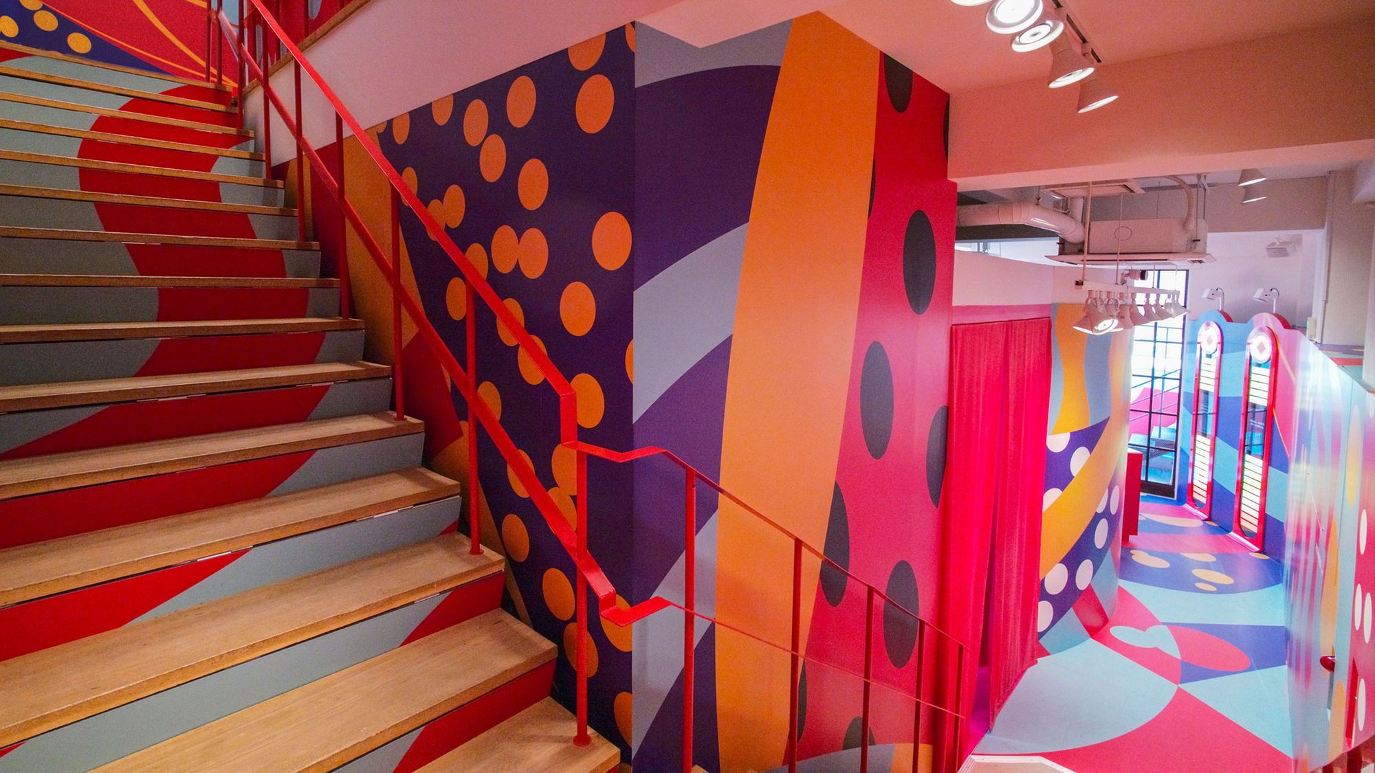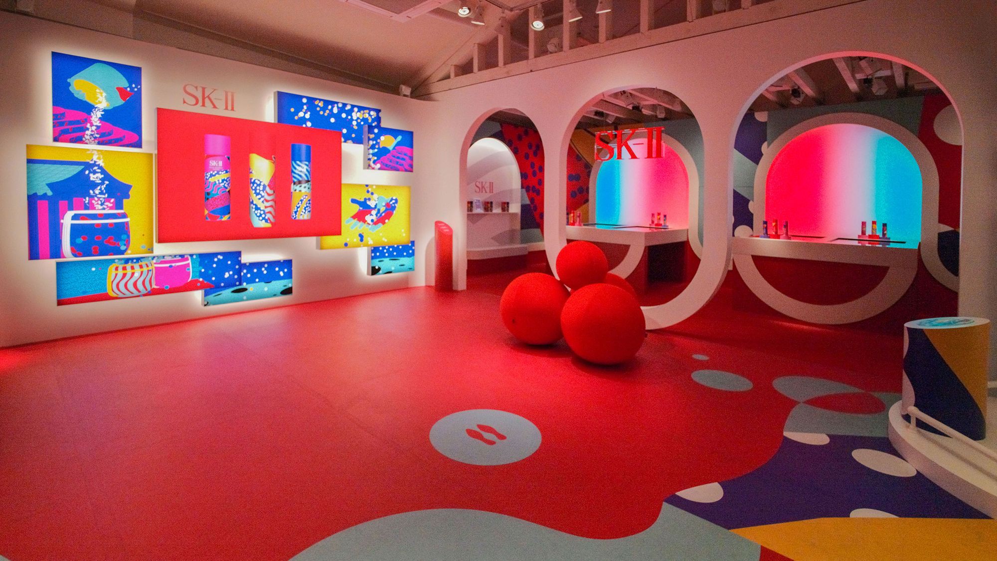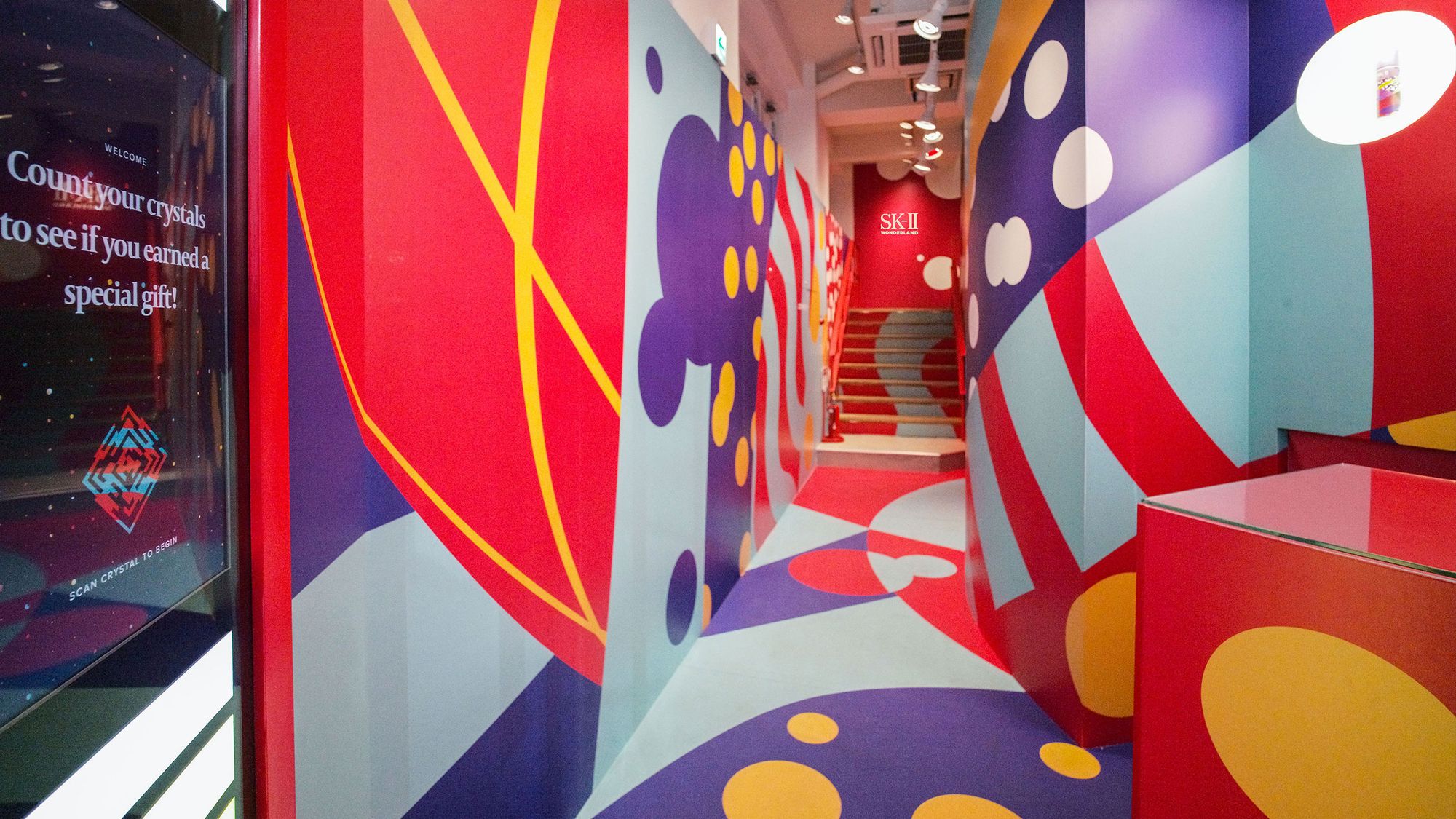 The first floor of the show has three rooms with each different designs inspired by the limited edition bottles. Visitors use the SK-II Wonderland app to open the room to a whole world of colors. On the second floor, you can find out the age of your skin while learning about SK-II on the interactive table.